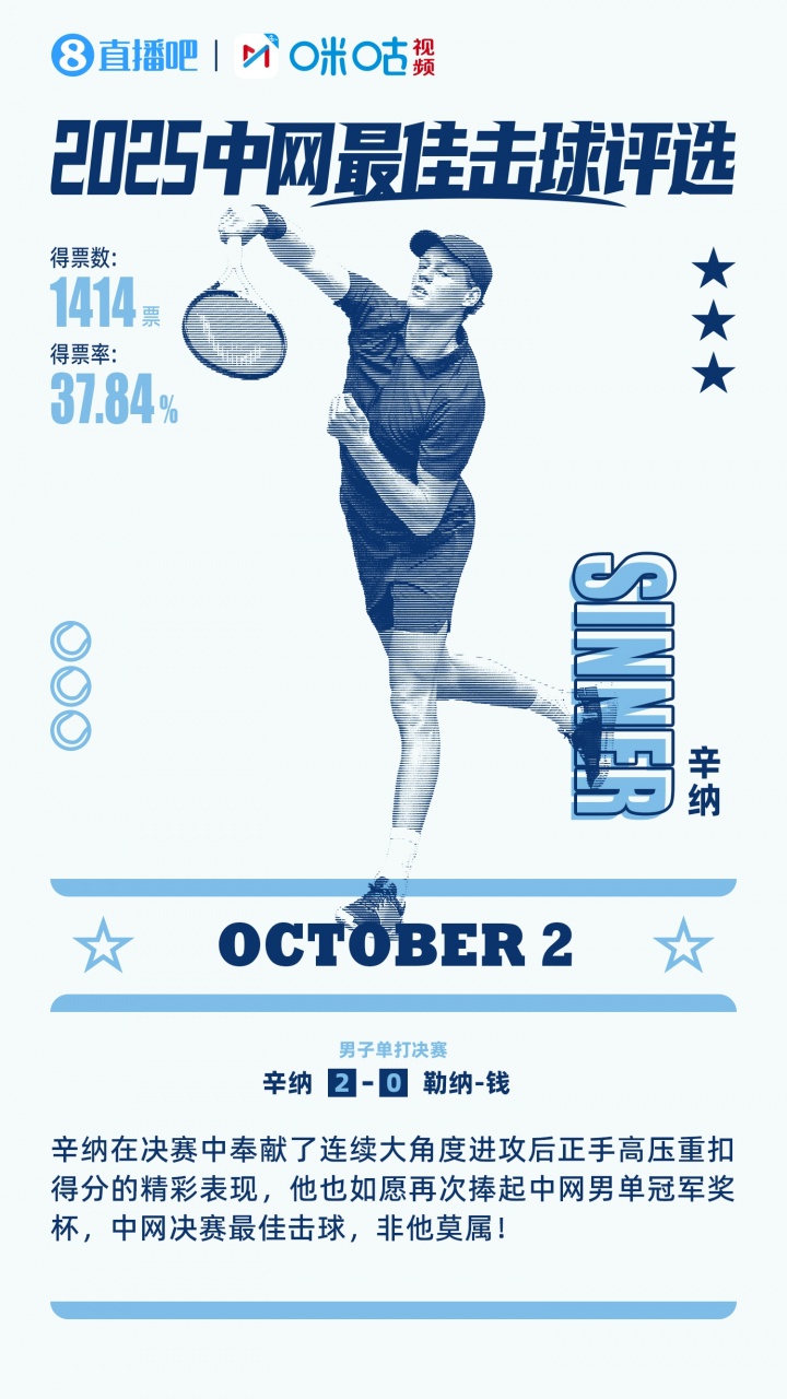 经过激烈的竞争,意大利选手辛纳以他卓越的表现赢得了许多球迷的心。他在比赛中频频展现出犀利的进攻,最终凭借一个精妙的正手高压重扣得分,吸引了近40%的投票,荣获ATP决赛的#中网最佳击球#称号。他的精彩表现无疑让这场赛事更加精彩。