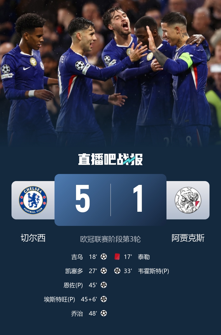 比赛进入第28分钟,凯塞多在禁区外调整后的一记远射,不经意间被对方挡了一下,意外地使得皮球改变轨迹,直入网窝,将切尔西的领先优势扩大到2-0。不久后,阿贾克斯在第32分钟通过韦霍斯特的点球扳回一城,令人看到了一丝希望。没想到,切尔西在短时间内又为追梦的阿贾克斯浇下了冷水,在第44分钟和补时阶段,恩佐与埃斯特旺各自获得点球机会,双双命中,让上半场的比分来到了4-1。