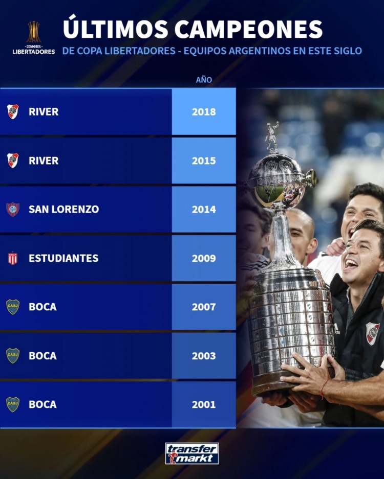 自本世纪以来,阿根廷球队在南美解放者杯的表现并不理想,仅有博卡青年、拉普拉塔大学生、圣洛伦索和河床四个球队曾获得冠军。这其中,河床在2018年取得了最后一次的胜利。博卡青年则在2023年重回决赛舞台,却未能再度捧杯。