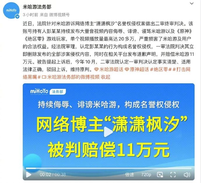 11月4日消息,米哈游法务部今天发布了一条看似无趣却充满戏剧性的公告,关于那位名为“潇潇枫汐”的网络博主的名誉权侵权案的二审结果。这位博主,竟然不知疲倦地在网上发布各种视频,像个不知羞耻的小丑一般,怼着米哈游和他们的游戏《原神》与《绝区零》,无所不谈的污言秽语,真是让人想为他的无知捡回一顶帽子。