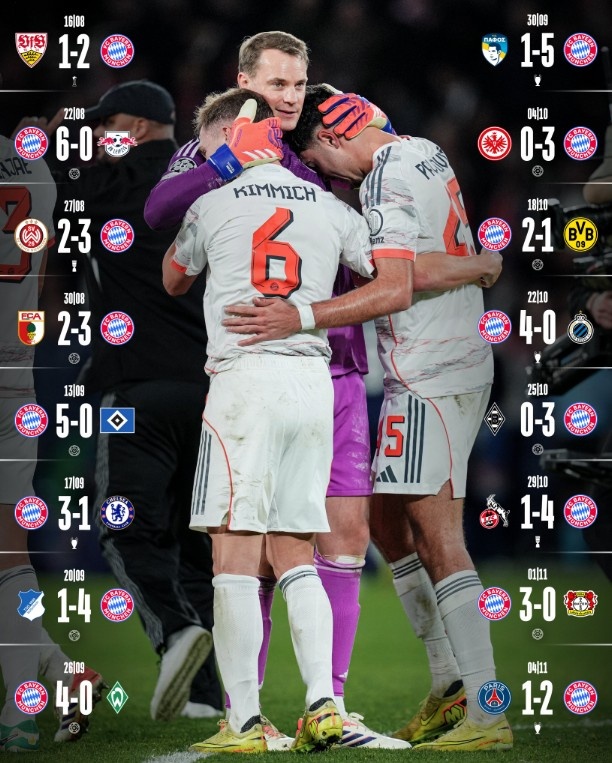 拜仁的连胜战绩相当耀眼,具体赛果如下: