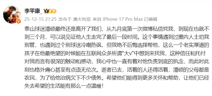 12月15日讯,令人痛心的是,因戴琳拖欠的救命钱而饱受折磨的山东球迷潘硕,最终走完了他的人生旅程。媒体人李平康对此表达了深切的哀悼和感慨。他回忆起九月底,潘硕在微博上第一次私信联系他,那时距今仅仅三个月,却仿佛是人生中的漫长岁月。