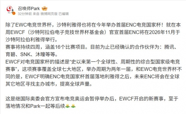 1月8日,微博用户“召唤师park”发布消息,透露了关于2026年新 esports赛事的动态。沙特阿拉伯的利雅得将在今年举办首届ENC电竞国家杯,此外,还将举行EWC电竞世界杯。EWCF(沙特阿拉伯电子竞技世界杯基金会)已正式宣布,ENC将于2026年11月在利雅得举行。