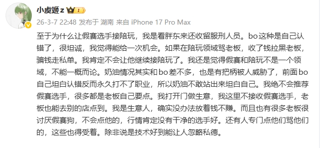 他提到,之所以让假赛选手参与陪玩服务,是因为他认为每个人都有改正的机会,就像胖东来对服刑人员的接纳一样。对于bo这样的选手,他表现出了坦诚的态度,承认错误并希望能给予其一次机会。而在陪玩行业中,若有人因为骂老板而欺骗并消失,那毫无疑问,就不应该允许其继续进入市场。